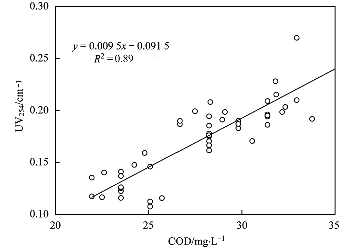 有研究表明, UV254與COD有一定的相關性, UV254值越小, 可生化性就越強, 水中復雜有機物分解及去除效果就越好.對本實驗數據進行COD與UV254之間離散關系分析如圖 3所示, 并得出相關系數為0.89, 說明COD與UV254之間具有強相關性.