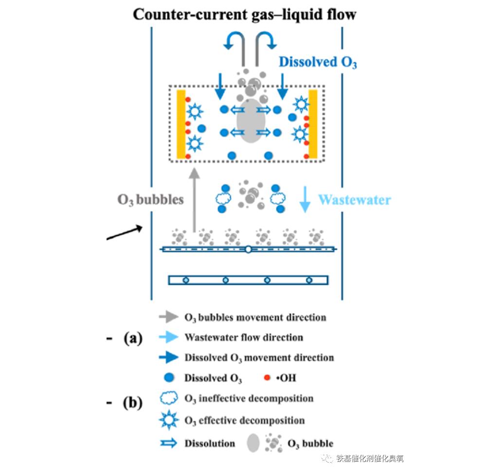 從工程工藝角度,催化劑整砌填料是反應的內因;而反應器,是催化臭氧化的外因。我曾吃驚地發現,我們對此了解得甚少,由此限制了催化臭氧化效率的提高。除氧化反應,反應器中多相變化有:一相溶解(臭氧向水相溶解);二相流動(氣泡上浮、水流動);三種分解(臭氧在氣相分解、在液相無效分解;在催化劑區有效分解),如圖示。