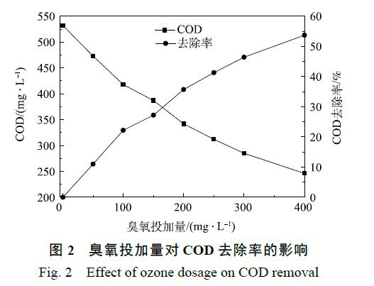 實驗選取了 4 個不同的 pH,用 NaOH 調節廢水 pH,臭氧催化氧化時間為 60 min,臭氧的投加量為 300 mg·L−1。由 圖 4 可知,初 始 pH 對臭氧催化氧化降 解COD 的影響較大,隨著 pH 的升高,COD 的去除率呈上升趨勢,當初始 pH 從 5 升到 9 時,COD 的去除率從 46.4% 升至 52.1%。臭氧間接氧化較多發生在中、堿性條件下,臭氧在堿性條件下很不穩定,易促進其自身分解[18],可通過自發的一系列鏈式反應生成強氧化性的·OH[19],更有利于 COD 的去除。此外隨著廢水pH 的升高,水中 OH−濃度增加,加劇了臭氧分解產生·OH。