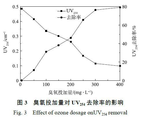 臭氧催化氧化實驗在室溫下進行,廢水初始 pH 為 5,反應時間為 60 min,通過調節臭氧進氣濃度控制臭氧的投加量,圖 2 和圖 3 為不同臭氧投加量條件下水中有機物的降解情況。由圖 2 可知,隨著臭氧投加量的增加,水中 COD 的去除率不斷升高,當臭氧投加量增 至 400 mg·L−1 時 , COD由 532  mg·L−1 降 至 246  mg·L−1, UV254 由 0.468降至 0.098,COD 和 UV254 的去除率分別升至53.7% 和 79.1%。COD 和 UV254 的去除率隨著臭氧投加量的增加而逐步升高,當臭氧投加量增到 300 mg·L−1 時,COD 和 UV254 的去除率開始趨于平緩,臭氧的利用率開始下降。臭氧催化氧化主要通過臭氧催化產生·OH,通過·OH 氧化水中有機物。隨著臭氧投加量的增加,有機物不斷被降解,隨著水中可被氧化的有機物的減少,·OH 與有機物發生碰撞的概率降低[17],從而導致臭氧的利用率下降。
