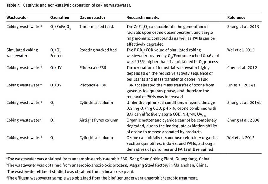 焦化廢水由于其復雜的組成和劇毒特性而受到了廣泛的關注。經過生物處理后,焦化廢水中仍殘留有酚類、苯類、多環(huán)芳烴(PAHs)和含氮雜環(huán)化合物。如表7所示,可以通過基于臭氧的技術有效地消除焦化廢水中的這些不可生物降解的有機污染物。可以發(fā)現(xiàn), 很關注的研究興趣在于降低焦化廢水出水的潛在風險,以及減少廢水中的有機污染物。通過與活性催化劑結合,提高臭氧的氧化能力。