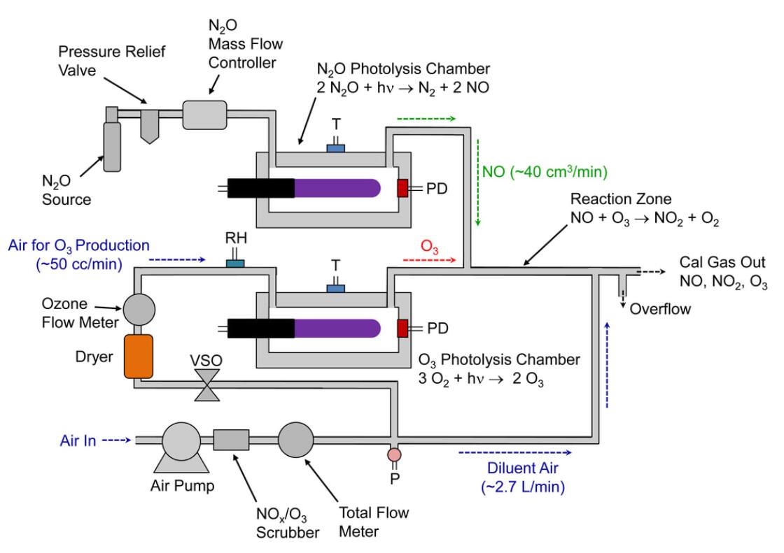 校準濃度的 O 3是通過光解凈化的環境空氣中的氧氣產生的,校準濃度的 NO 是通過使用一氧化二氮 (N 2 O )光解的技術產生的。