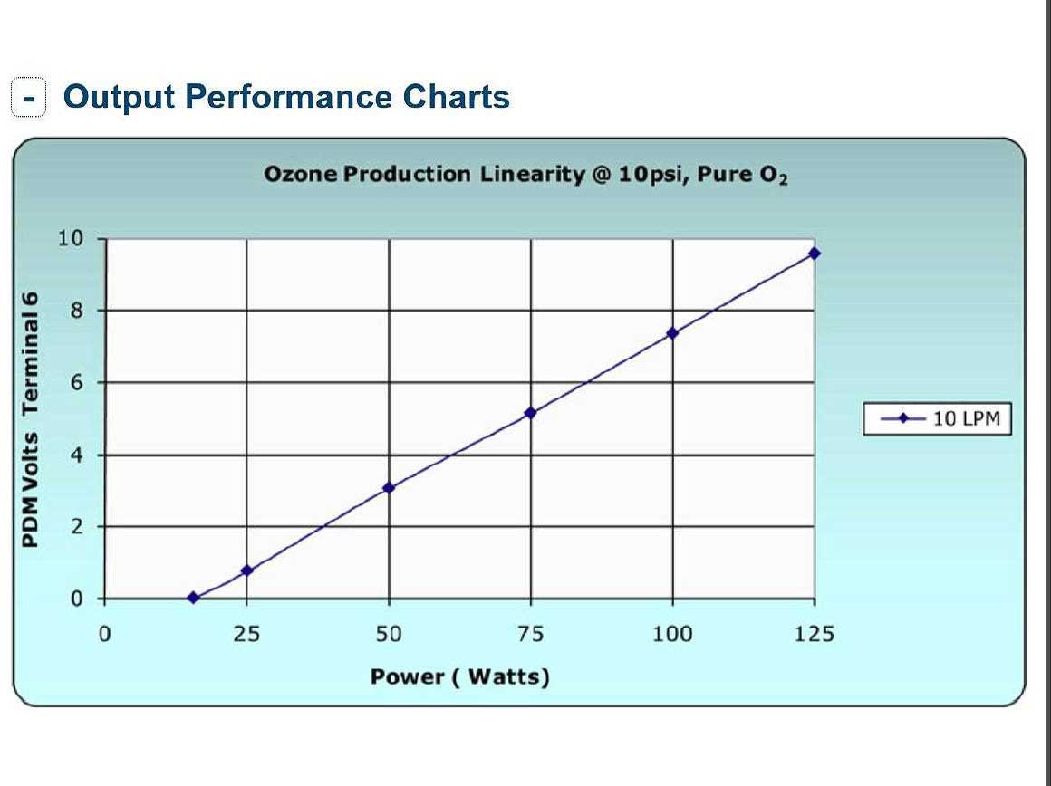 •             10 grams/hour, 5% concentration @ 2 LPM oxygen feed, 10 psig